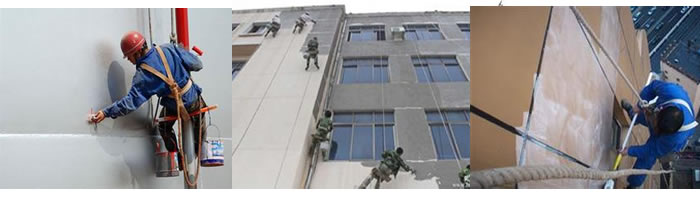 5、安全事项;本施工为吊挂高空作业,安全特别重要。除了工作绳还必须有保险绳,少为两人三绳(公用一根保险绳)所有的绳子要分开系牢于能够承重的固定物件上,绳子与物件的锐角之间一定要垫上厚厚的毛毯,以防锐角对绳子划伤,杜绝隐患!下吊一定要有监护人看护,下吊前就要系牢安全带,制锁器,并戴好安全帽及劳保用品,备全操作工具和材料,一次性不要放太多的材料,以减轻负荷。严禁下吊后再系安全带,制锁器!操作时要先放制锁器,再下坐板,左右摆动幅度不要超过3M。遇到5级以上的大风时严禁进行吊挂作业。