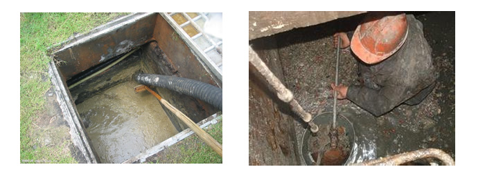 (一)地面作业  1.用铁钩打开污油、水池的盖板后,所有作业人员不可在现场抽烟及使用明火,防止沼气引起爆炸、及燃烧而发生意外,等待10-15分钟用消防水枪对化油池进行级稀释,再用长竹杆(5m)搅散化油池内杂物结块层,方便吸取。  然后用吸管进行试吸可以吸取循环进行,反之则进行化油剂对要清理的污油进行稀再用长竹杆(5m)搅散化粪池内杂物结块层,方便吸取。     2、.化油池井盖打开后工作员不能离开现场,清洁完毕后,应立即盖好井盖,以防行人掉入井内发生意外。     3、污水池用现场的消防水冲淡后直接抽排向市政排汅管道,(市政管理干涉或是罚款由环保公司承担一切责任)。    4.把吸污车开到工作现场,套好吸污胶管(5m长,备3条)放入化粪池内。     5.启动吸污车的开关,吸出污水直至化油池内的化油结块物吸完为止,注意过程中防止弄脏工作现场和过往行人的衣物。  6.完毕后盖好化油池井盖,用清水冲洗干净工作现场以及所有工具。 。    7.清理后,目视井内无积物浮于上面,出入口畅通,保持污水不得溢出地面。    8、一般情况下不建议下池作业,防止人员中毒或陷入水中,造成隐患。    9、如果在清理中不可不下池作业时要慬遵如下原则。